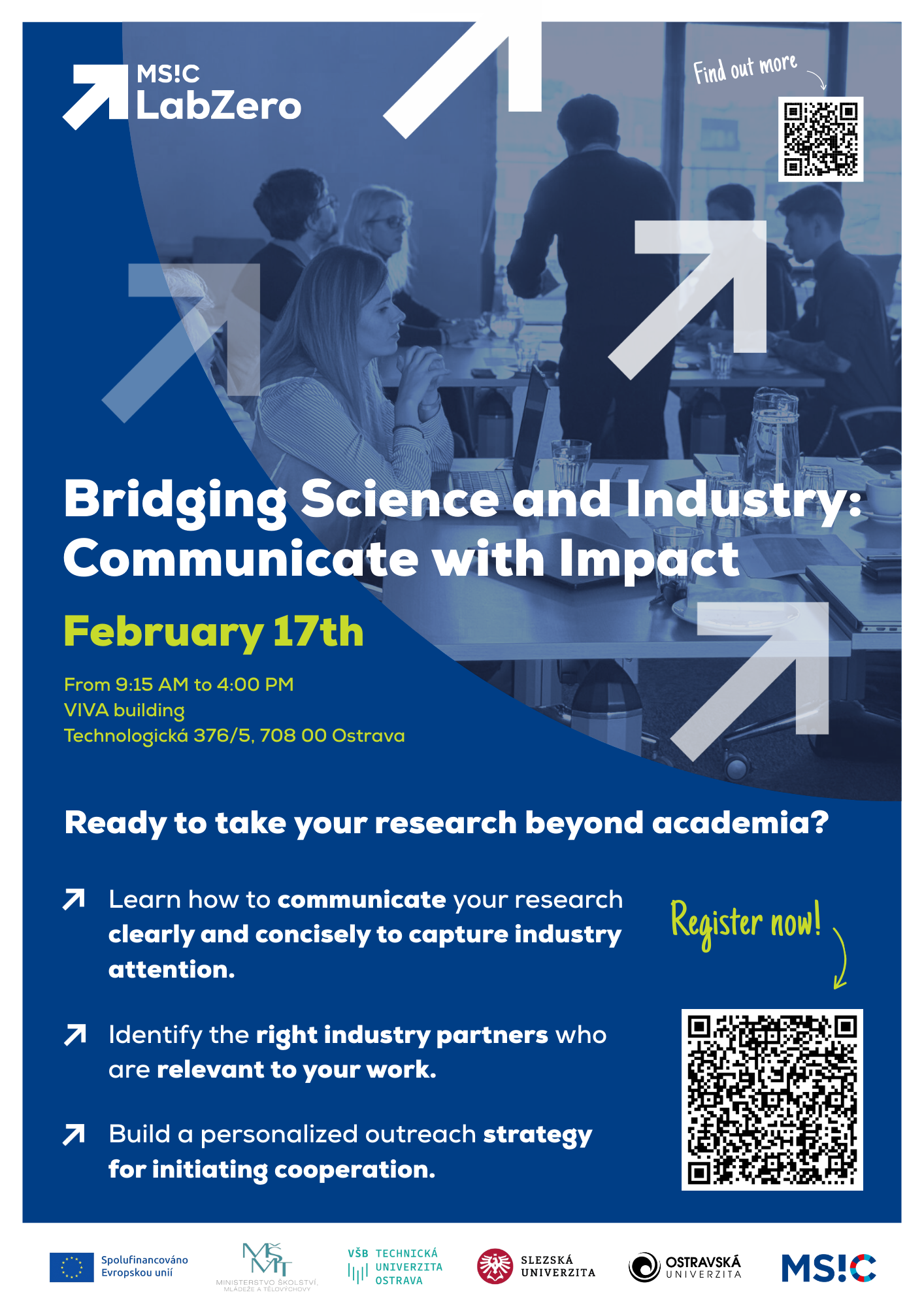 - Naučíte se srozumitelně a stručně komunikovat svůj výzkum tak, aby zaujal průmyslové partnery.